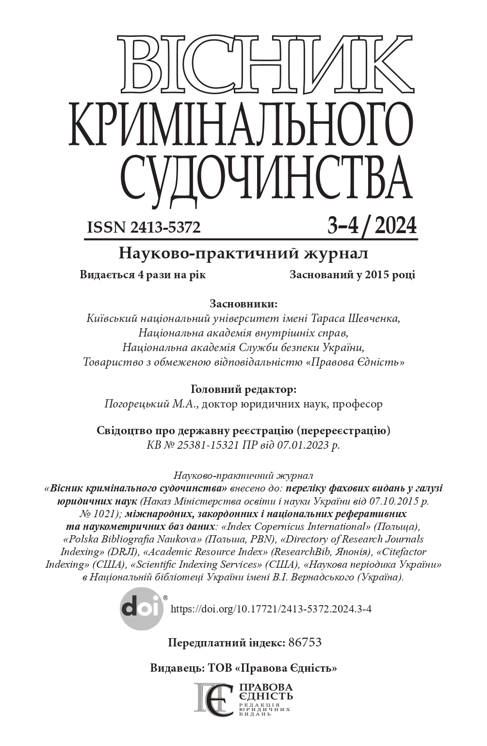 НАУКОВО-ПРАКТИЧНИЙ ЖУРНАЛ "ВІСНИК КРИМІНАЛЬНОГО СУДОЧИНСТВА"